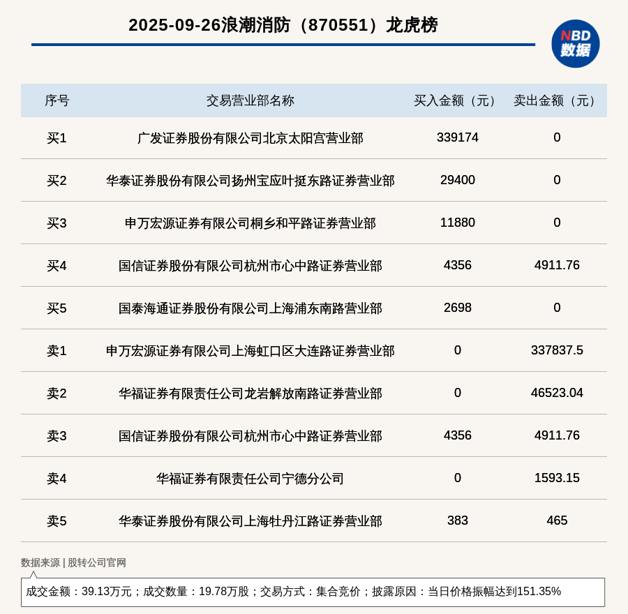 每經(jīng)訊,2025年9月26日,新三板創(chuàng)新層公司浪潮消防(870551,收盤價:1.95元)登上龍虎榜,交易方式是集合競價,披露原因是當日價格振幅達到151.35%,成交數(shù)量19.78萬股,成交金額39.13萬元。買一席位為廣發(fā)證券股份有限公司北京太陽宮營業(yè)部,買入33.92萬元;賣一席位為申萬宏源證券有限公司上海虹口區(qū)大連路證券營業(yè)部,賣出33.78萬元。
