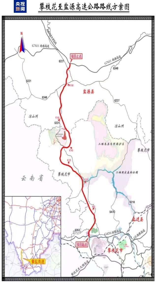 項目起于涼山州鹽源縣棉椏鎮(zhèn),止于攀枝花市仁和區(qū)太平鄉(xiāng),全長約131.3公里,其中攀枝花境內(nèi)約86.3公里,涼山州境內(nèi)約45公里。全線采用雙向四車道高速公路標準建設(shè),設(shè)計時速80公里,路基寬度25.5米,設(shè)橋梁67座、隧道20座、互通式立交10處,橋隧比約80%。