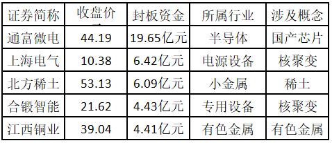 從封板資金來看,今日漲停板個股中,封板資金排名前5的個股包括通富微電、上海電氣、北方稀土、合鍛智能、江西銅業(yè)。歡迎大家關(guān)注微信公眾號“道達(dá)號”,“道達(dá)漲停復(fù)盤”欄目為大家復(fù)盤市場漲停數(shù)據(jù)。