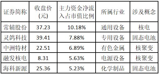 主力資金凈流入金額占市值比例排名前5的個股分別為常輔股份、靈鴿科技、中洲特材、融發(fā)核電、海科新源。