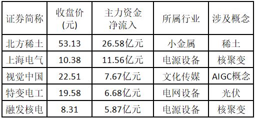 從主力資金來看,今日漲停板個股中,主力資金凈流入金額排名前5的個股分別為北方稀土、上海電氣、視覺中國、特變電工、融發(fā)核電。