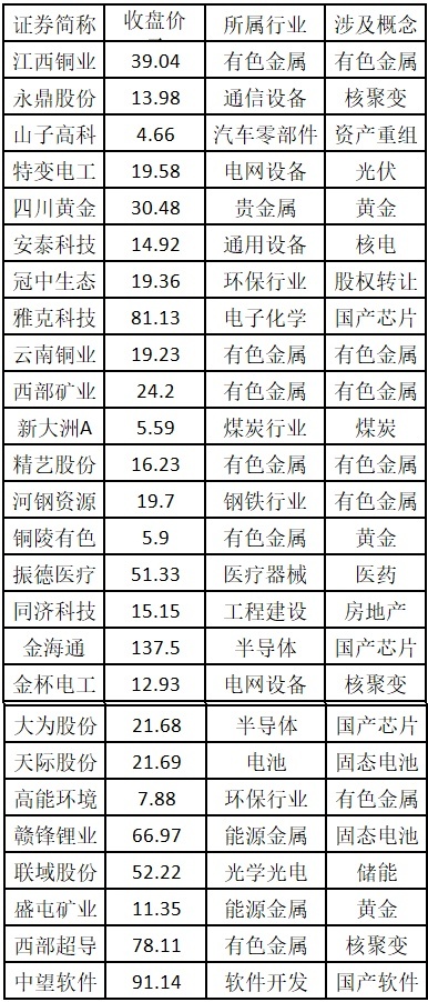 漲停板個股中,股價(jià)創(chuàng)出近一年新高的個股有26只(不包括創(chuàng)出歷史新高的個股),包括江西銅業(yè)、永鼎股份、山子高科、特變電工、四川黃金、安泰科技、冠中生態(tài)、雅克科技、云南銅業(yè)、西部礦業(yè)、新大洲A、精藝股份、河鋼資源、銅陵有色、振德醫(yī)療、同濟(jì)科技、金海通、金杯電工、大為股份、天際股份、高能環(huán)境、贛鋒鋰業(yè)、聯(lián)域股份、盛屯礦業(yè)、西部超導(dǎo)、中望軟件,具體如下表所示。