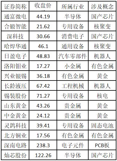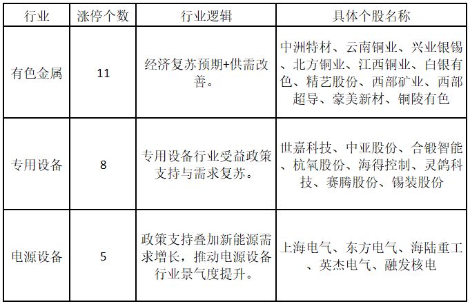 從行業(yè)特征來看,今日漲停板個股中,有色金屬、專用設(shè)備、電源設(shè)備行業(yè)的個股最多。