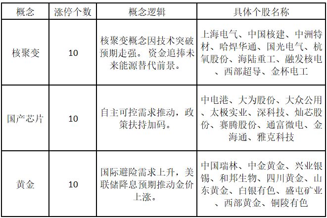 從概念特征來看,今日漲停板個股中,核聚變、國產(chǎn)芯片、黃金概念的個股最多。