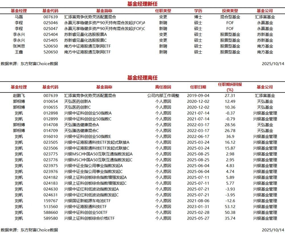每經(jīng)AI快訊,據(jù)東方財富Choice數(shù)據(jù)統(tǒng)計,今日新聘基金經(jīng)理5人,涉及6只基金(A/C類分開計算),主要來自南方基金、永贏基金等公司。另外,今日有3位基金經(jīng)理離任。