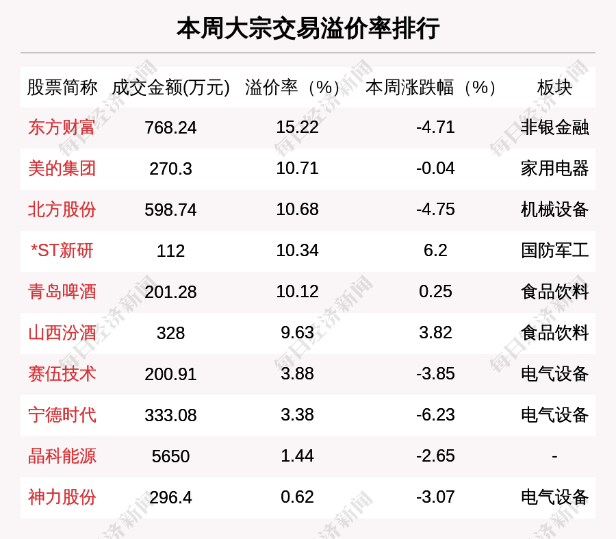 溢價交易方面,本周有5筆大宗交易溢價率超過10%。