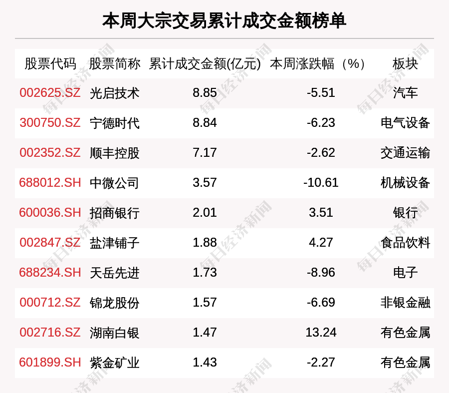 本周大宗交易累計(jì)成交金額前3的公司是光啟技術(shù)、寧德時代、順豐控股,累計(jì)成交金額分別為8.85億元,8.84億元,7.17億元。