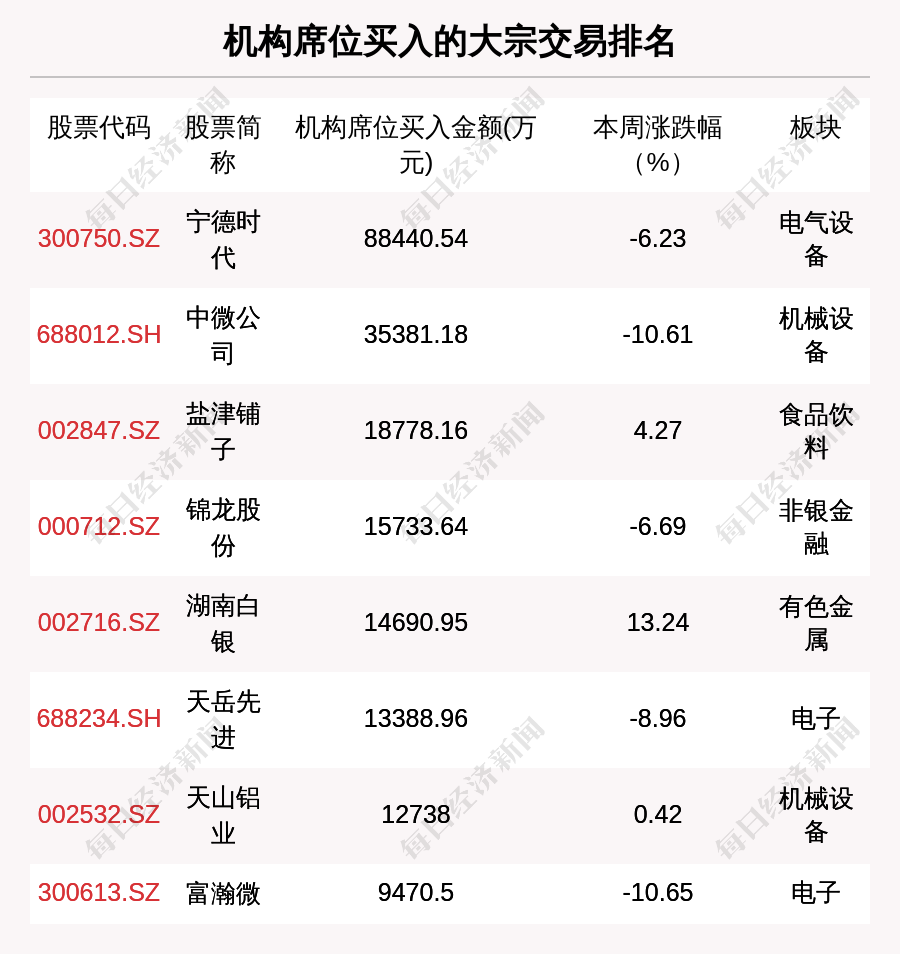 本周機(jī)構(gòu)專用席位參與了139筆大宗交易,環(huán)比上周減少31筆。本周機(jī)構(gòu)席位買入金額前3的公司為寧德時代、中微公司、鹽津鋪?zhàn)?,機(jī)構(gòu)買入金額分別為8.84億元、3.54億元、1.88億元。