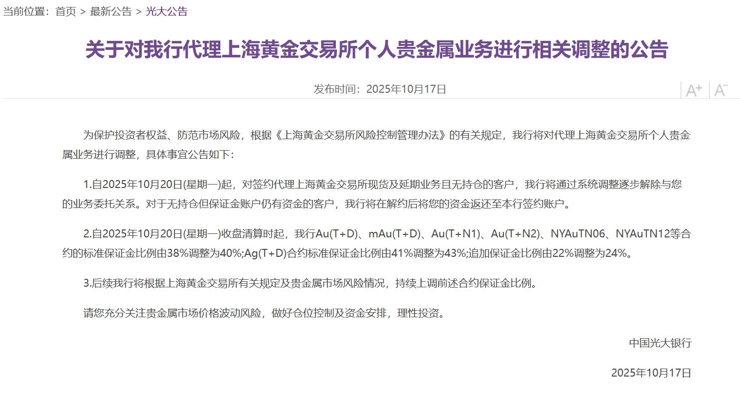 此外,上海黃金交易所也將黃金交易的保證金提高,根據(jù)相關(guān)公告,自2025年10月20日(星期一)收盤清算時起,光大銀行Au(T+D)、mAu(T+D)、Au(T+N1)、Au(T+N2)、NYAuTN06、NYAuTN12等合約的標準保證金比例由38%調(diào)整為40%;Ag(T+D)合約標準保證金比例由41%調(diào)整為43%;追加保證金比例由22%調(diào)整為24%。