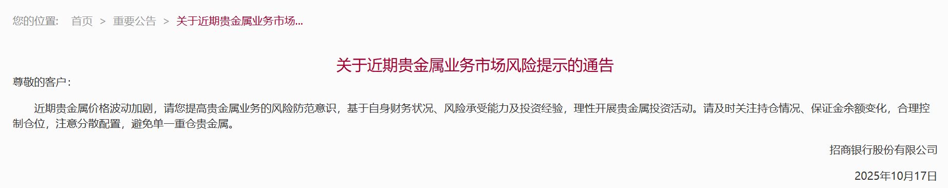招商銀行也表示, 及時關(guān)注持倉情況、保證金余額變化,合理控制倉位,注意分散配置,避免單一重倉貴金屬。