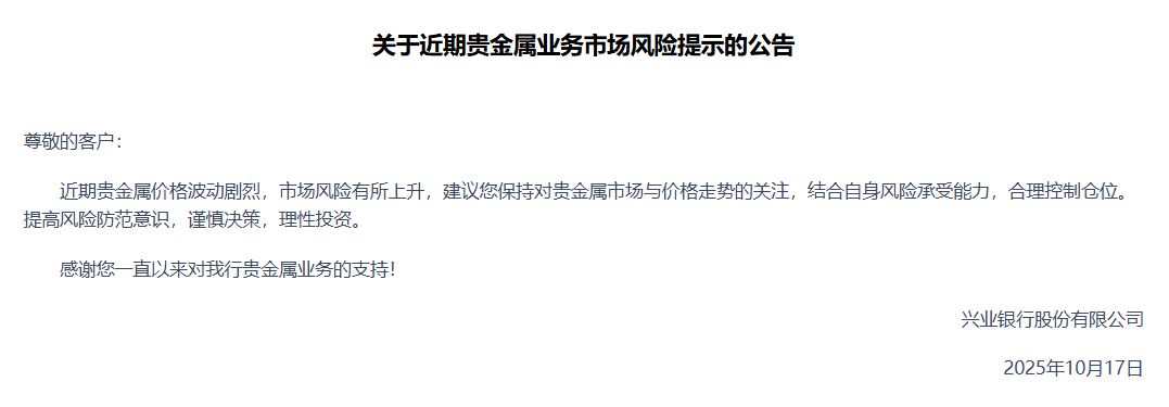 除了光大銀行之外,興業(yè)銀行、招商銀行、建設銀行等多家銀行,也對近期貴金屬業(yè)務市場風險發(fā)出明確的提示。