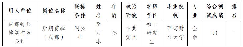 根據(jù)我司前期發(fā)布的招聘公告及招聘相關(guān)規(guī)定,經(jīng)資格審核、面試、復(fù)試、背景調(diào)查、體檢等程序,擬聘李雨冰為后期剪輯(成都),現(xiàn)將名單予以公示。