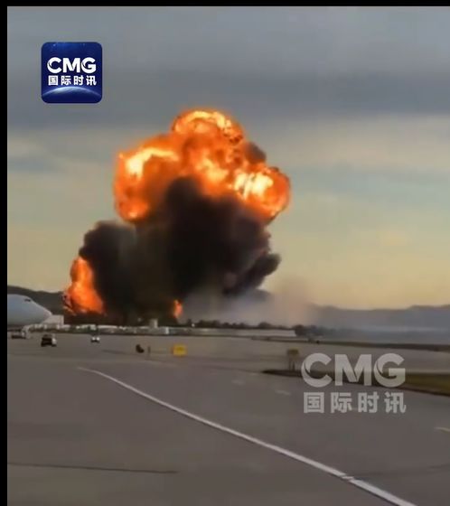 機(jī)場附近升起滾滾濃煙。目前緊急救援人員正在趕往現(xiàn)場。