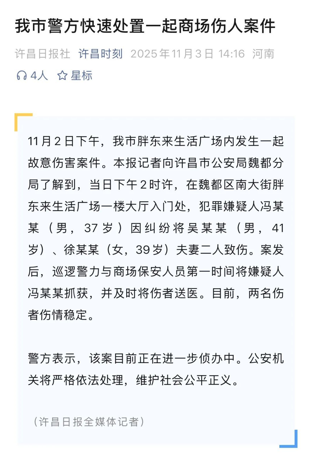 11月3日,許昌日?qǐng)?bào)社官方賬號(hào)“許昌時(shí)刻”發(fā)文“我市警方快速處置一起商場(chǎng)傷人案件”: